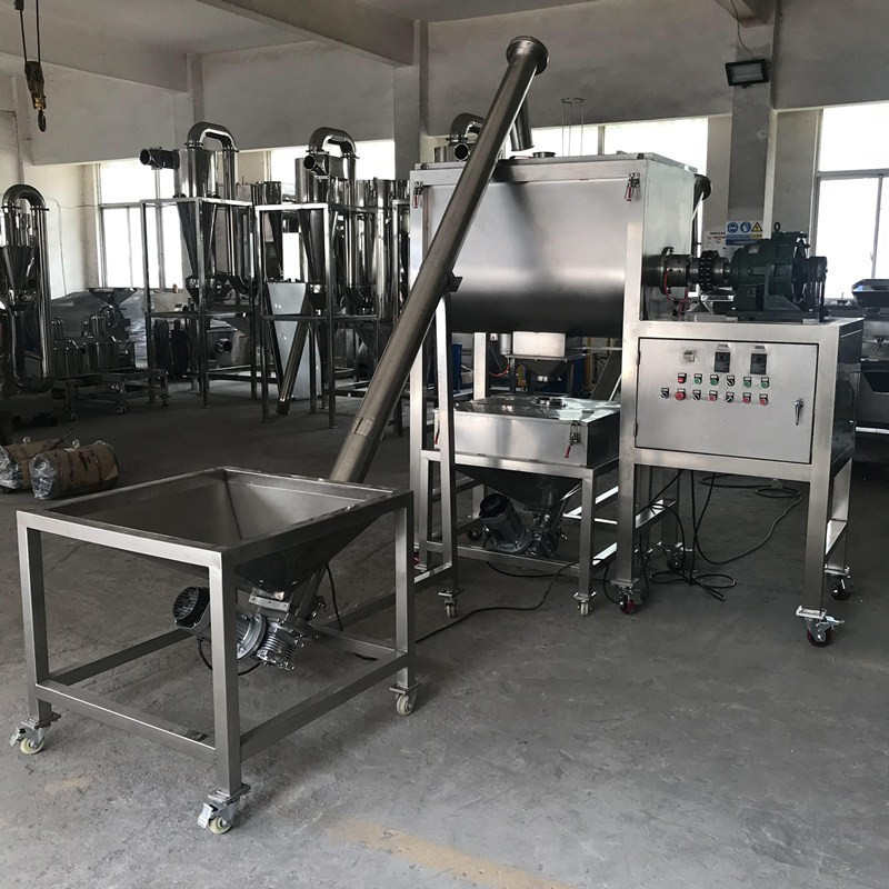 c: Linea di produzione: Il doppio miscelatore del nastro può funziona con il trasportatore di vite, il saltatore ed il riempitore della coclea per formare le linee di produzione.