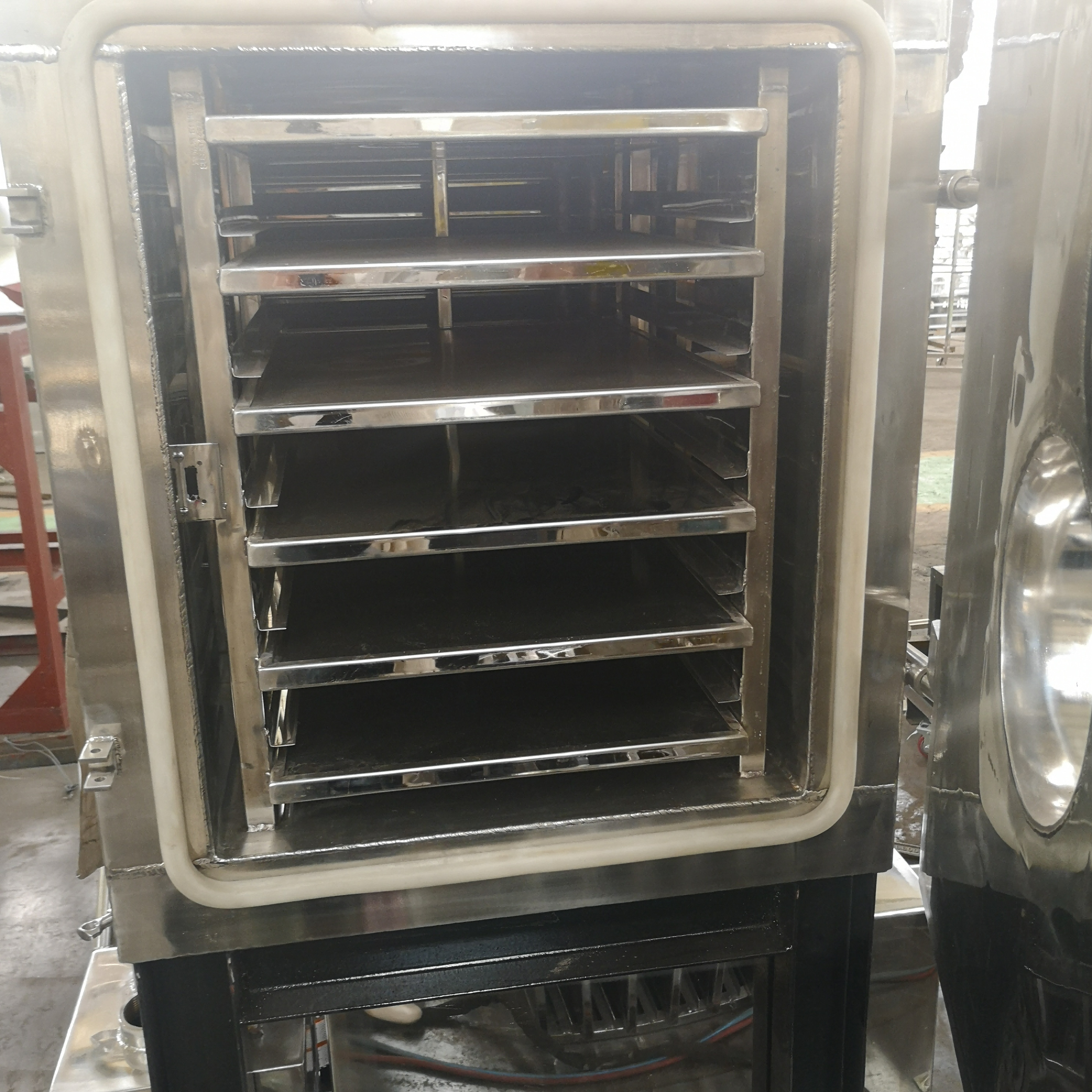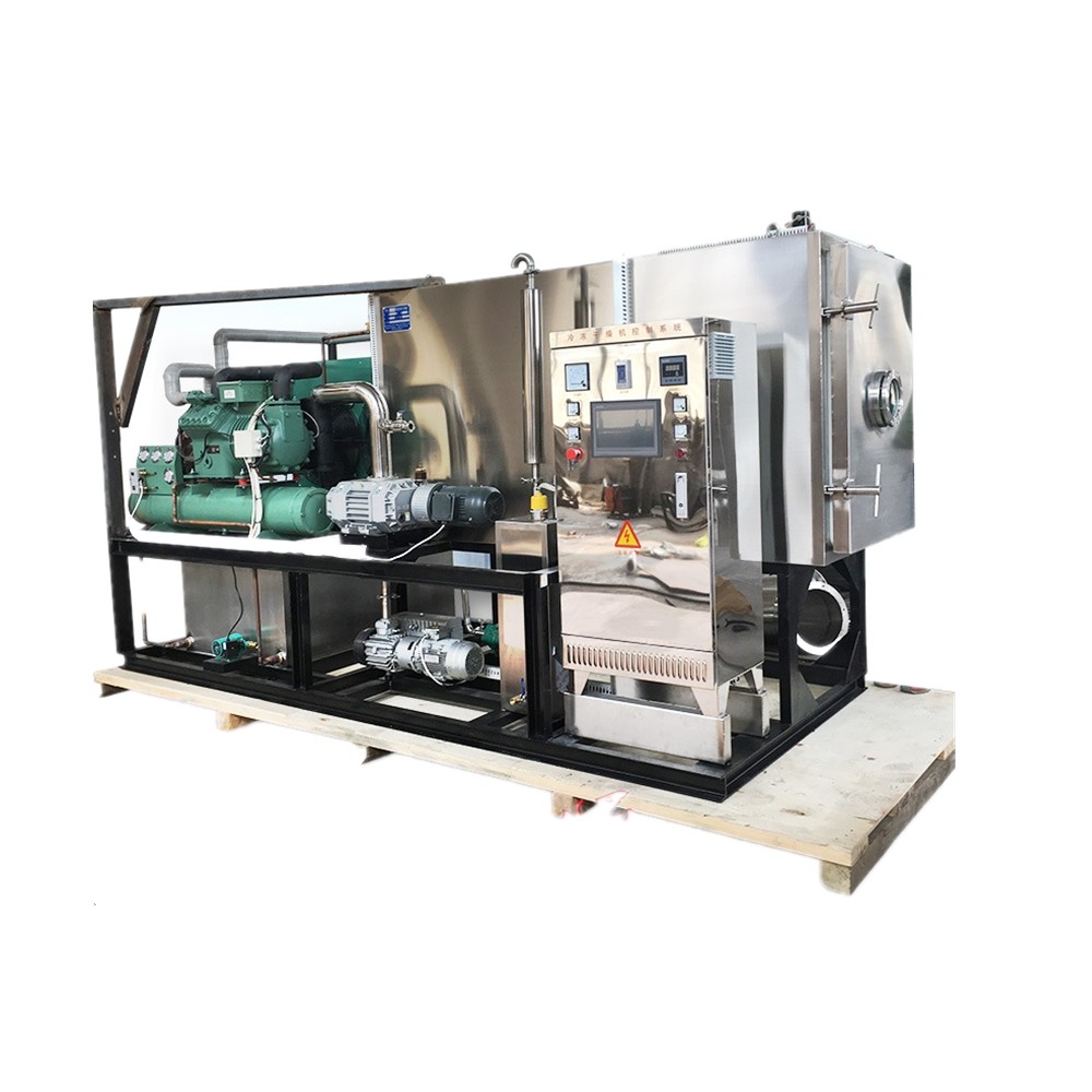 L'essiccatore di gelata è composto di sistema di refrigerazione, di sistema di vuoto, di sistema di riscaldamento e di sistema di controllo elettrico di strumentazione. Le componenti principali è forno, il condensatore, le unità di refrigerazione, dispositivi di riscaldamento/di raffreddamento dei pulsometri. Il suo principio di lavoro è di fare il materiale è congelato sotto una determinata temperatura e poi nei termini del vuoto lo stato solido dell'acqua (ghiaccio) direttamente è sublimato nel vapore acqueo ed è scaricato fuori per ottenere gli oggetti asciutti.